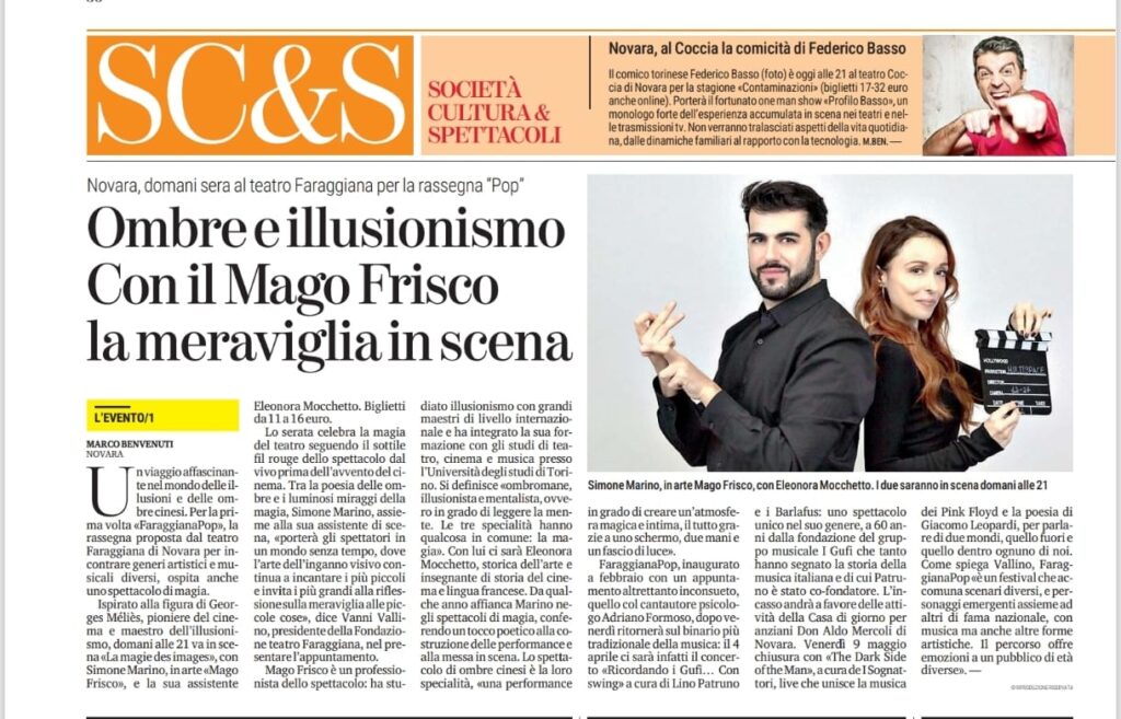 Sono Simone Marino, in arte Mago Frisco, prestigiatore professionista da oltre dieci anni. La mia specialità, oltre allo spettacolo di magia, è l’arte delle ombre cinesi. Mi sono esibito in tutto il mondo in contesti differenti (televisione, navi da crociera, villaggi turistici, eventi privati ecc.) e realizzo spettacoli su misura per ogni necessità.